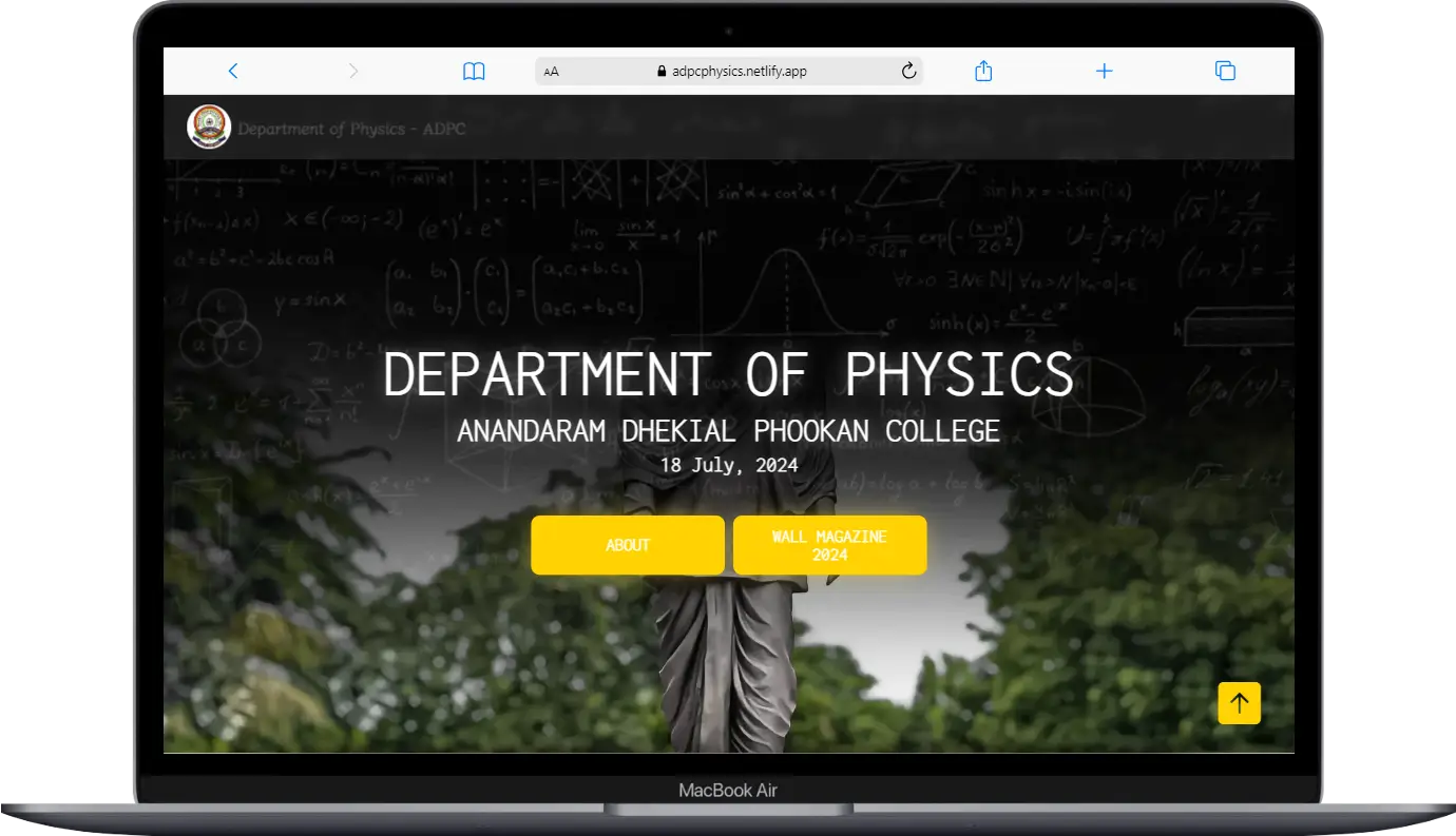 A portfolio website for the Department of Physics of my current institution, Anandaram Dhekial Phookan College. Basically, it was designed to showcase our annual wall magazine and some basic information about our department.