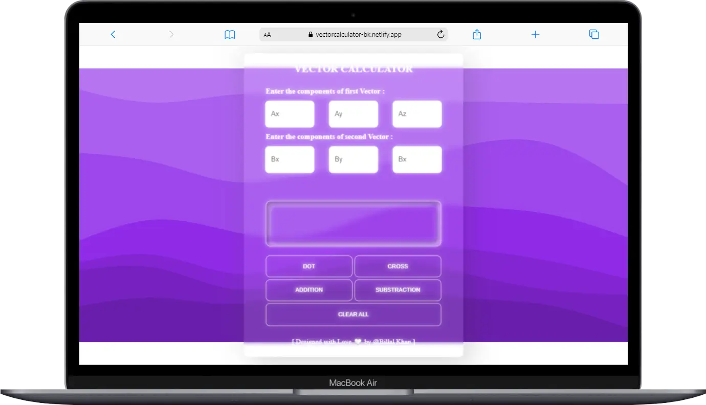 Currently, I am exploring the field of web development and learning from open sources such as YouTube, documentation, ChatGPT, and demo projects. After successfully grasping some concepts in web development, I have created a website. Currently, I am focusing on learning JavaScript, and for practice, I have initiated a vector calculator project. The main objective of this application is to perform vector operations such as addition, subtraction, dot product, and cross product of vectors.